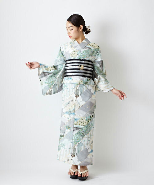 浴衣 単品「サーシャのお散歩」(フルッタロッサ)ふりふセレクト 日本製 ゆかた 街並み ねこ 総柄 洋風 夏 レトロ モダン ポップ かわいい お洒落 華やか レトロ浴衣 青系 グレー