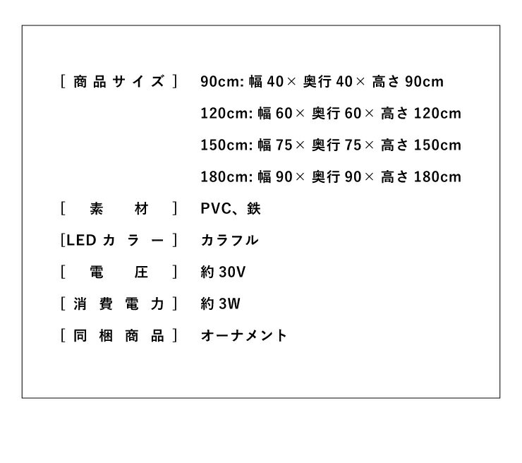 商品サイズ900×900×1800cm素材PVC、鉄LED カラーカラフル電圧:31VLED数:-消費電力:3.6W同梱商品オーナメント【オーナメントセット内容】トップスター:1個モール:270cm×2本ボール:9個ギフトボックス:6個リボン:10個トップリボン:1個プレート:1個LED電球:40球 560cmILLUMINATION SET TREE 90cm150cm180cm