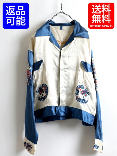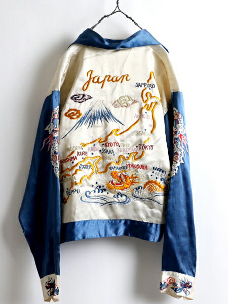 50's ★ JAPAN 龍 刺繍 サテン スーベニア スカ シャツ ジャケット ( メンズ 男性 M程 ) 50年代 ビンテージ 古着 スカシャツ スカジャン | 【US古着】【古着】中古 アメリカ古着 古着屋 ブルー シルバー 青 銀 シャツジャケット 長袖 日本地図 ライト アウター 上着